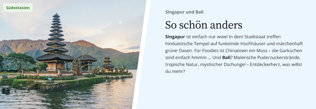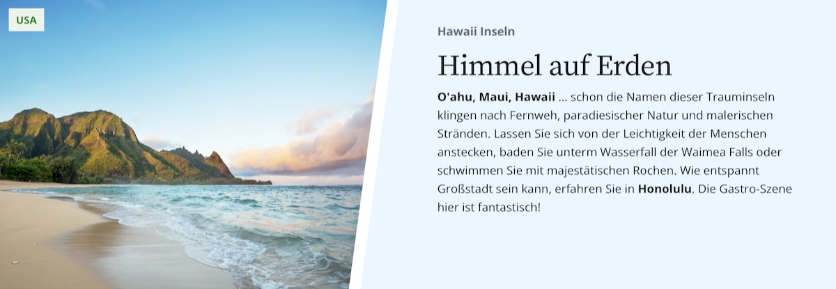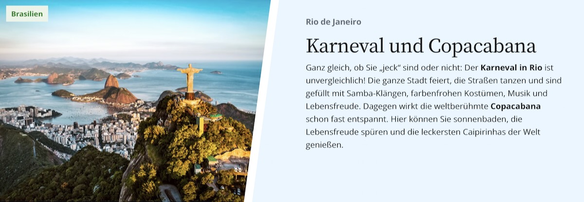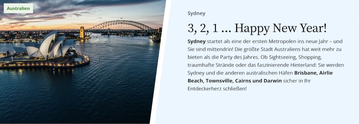 Ein Frühstück vor der Skyline von New York, baden an den Traumstränden der Südsee, zum Karneval in Rio tanzen: Freuen Sie sich jeden Tag auf neue kleine Wunder und unvergessliche Erlebnisse. Das neue Jahr in Sydney begrüßen, an den Traumstränden von Mauritius baden und die südafrikanische Wildnis entdecken. Ihr Traum einer Weltreise ist zum Greifen nah! Sehen, fühlen und verlieben Sie sich in die Wunder unserer Erde und starten Sie ein unvergessliches Abenteuer.