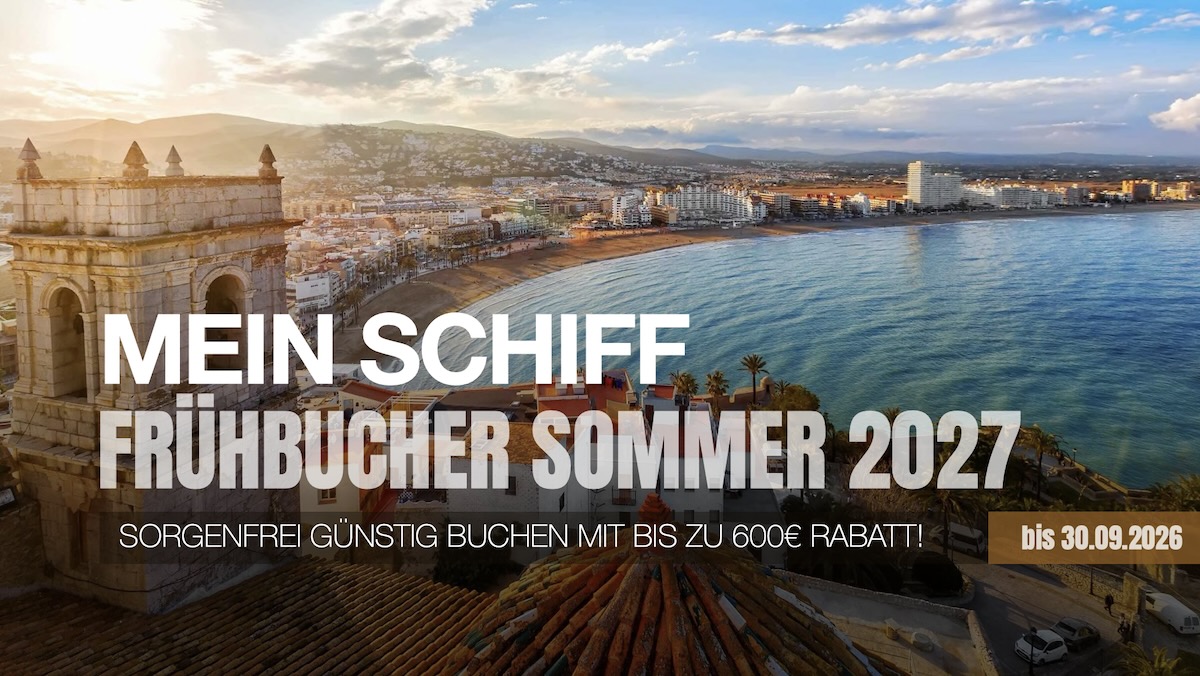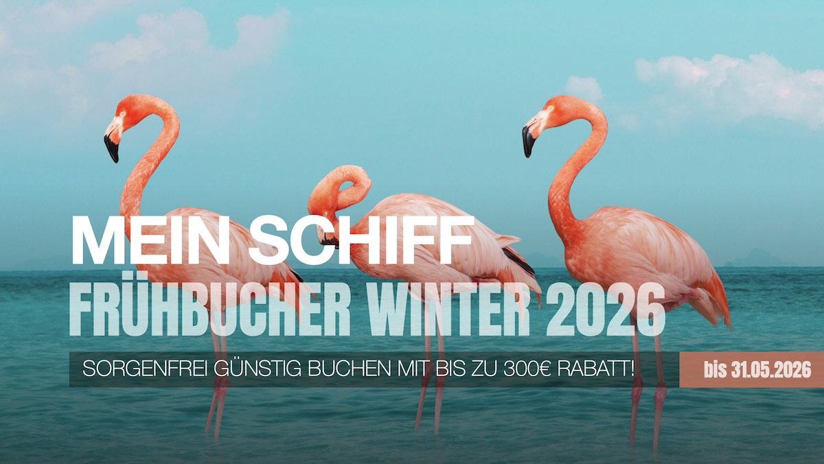 Wußten Sie schon das bei MEIN SCHIFF der Frühbucher-Rabatt 1 der beste und in 90% günstigste Reisepreis überhaupt ist. Sie können Ihre Kabine wählen, Sie können im Falle das Ihnen etwas dazwischen kommt oder Ihr Urlaub nicht wie geplant stattfindet, einmal bis 50 Tage vorher, kostenlos umbuchen. Obendrein profitieren Sie von den besten Flugpreisen und haben noch die grösste Auswahl bei den Abflughäfen. Als Alleinreisender müssen Sie keine überhöhten Reisepreise zahlen, Sie können, die auf vielen neuen Schiffen, angebotenen Einzelkabinen buchen. Zu guter letzt geniessen Sie die VORFREUDE auf Ihre Reise sehr viel länger und dieses Gefühl ist einfach unbeschreiblich schön!